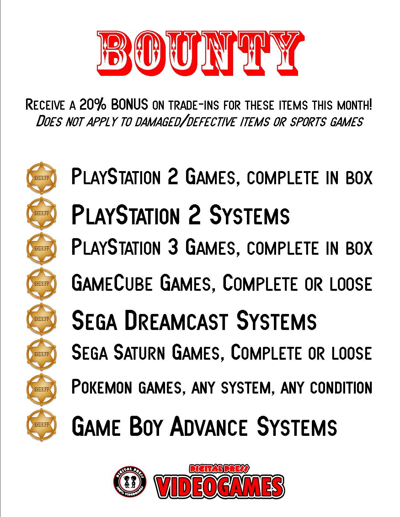 Trade In Bounty Submitted on Fri, 03/13/2026 - 18:24 We're always on the hunt for great games, and right now there's no better time to trade in at Digital Press of Clifton. We've offering a 20% bonus on Gamecube, PS2, Pokemon games and more this month!